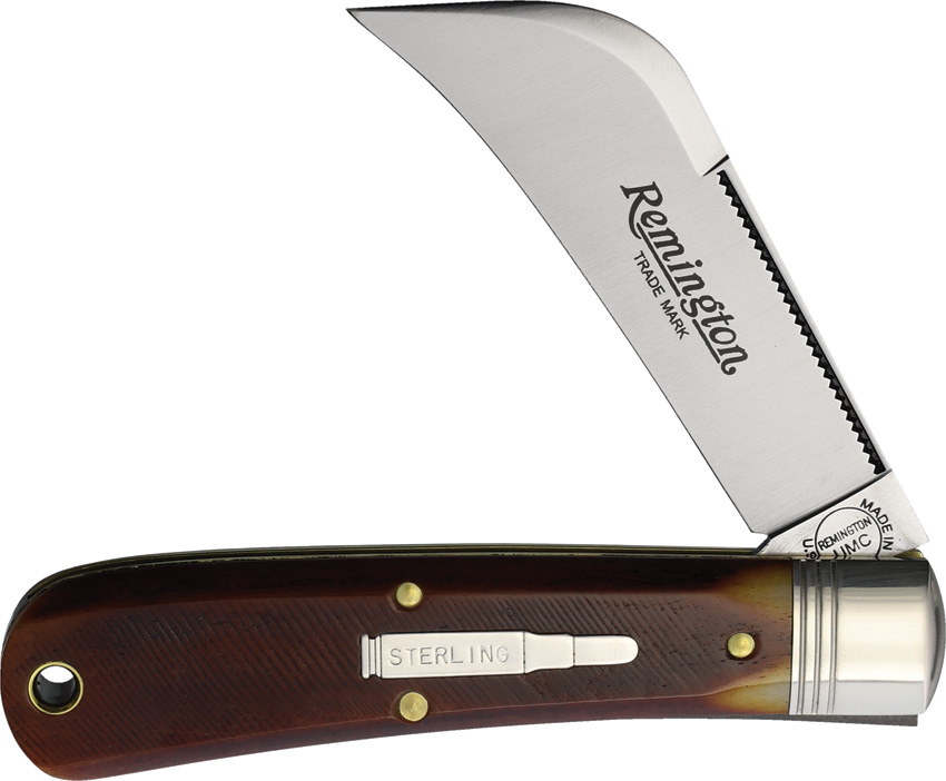 3.88″ (9.86cm) closed. Satin finish 1095HC steel hawkbill blade. Brown sawcut bone handle. Nickel silver bolster(s). Lanyard hole. Sterling silver bullet inlay shield. Box features “The One That Got Away” artwork. Gift boxed.