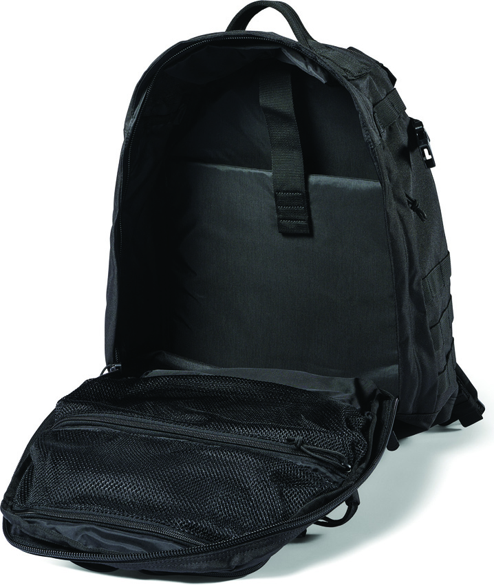 37 liter capacity. RUSH Tier compatible. Laser-cut MOLLE front panel. WEB platforms. Zippered side pockets. Admin panel, internal laptop compartment, and rear hydration compartment. 600D polyester construction. Color: Black. Bulk packed.