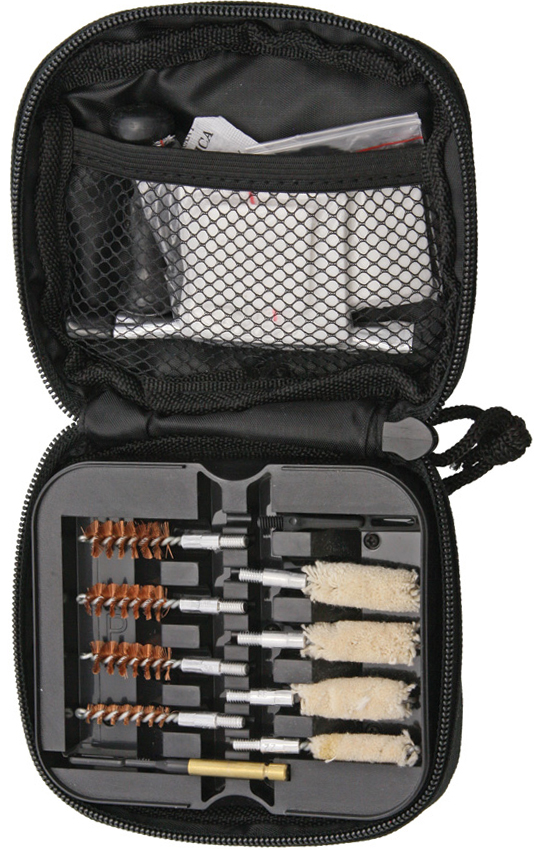 Kit includes: .Brass bore brushes and mops for the following calibers: 0.22 cal., 0.30 cal., 9mm/0.38 cal., 10mm/0.40 cal., 0.44/0.45 cal. 12″ pull cable and handle. Cotton patches. Patch puller. Cleaning brush. Packaged in 4″ x 5″ zippered water-resistant nylon pouch with MOLLE. straps. Black pouch.
