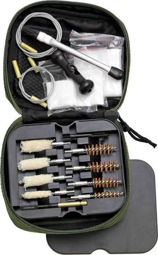 Kit includes: .Brass bore brushes and mops for the following calibers: 0.22 cal., 0.30 cal., 9mm/0.38 cal., 10mm/0.40 cal., 0.44/0.45 cal. 12″ pull cable and handle. Cotton patches. Patch puller. Cleaning brush. Packaged in 4″ x 5″ zippered water-resistant nylon pouch with MOLLE. straps. Olive green pouch.
