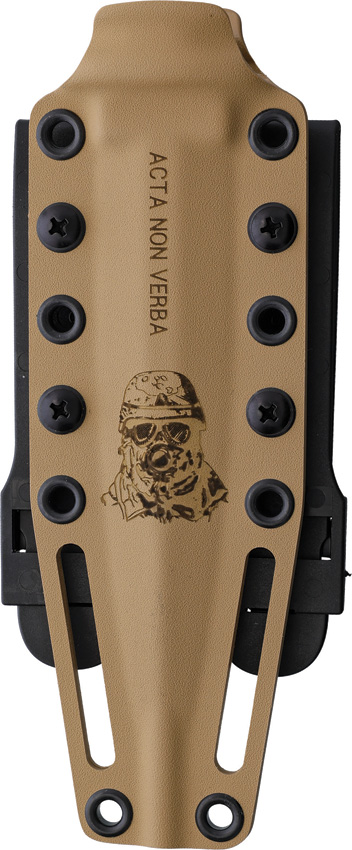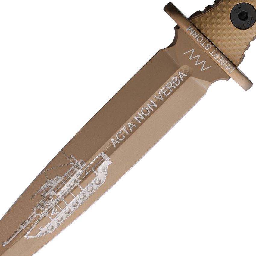 10.38″ (26.37cm) overall. 4.5″ (11.43cm) coyote tan DLC coated double edge Elmax steel dagger blade. Tan textured G10 handle. Stainless guard. Full, extended tang. Glass breaker. Desert Storm version. Tan Kydex belt sheath. Boxed.
