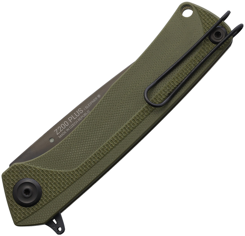 5″ (12.7cm) closed. 3.5″ (8.89cm) black DLC coated Sleipner tool steel spear point blade. OD green G10 handle. Extended tang. Pocket clip. Lanyard hole. Comes with three 3D-printed flippers made from PET-G (Black, OD, Orange). Boxed.