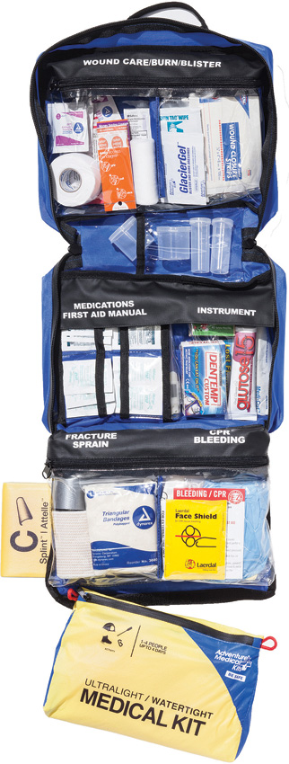 Supplies to diagnose and treat over 200 injuries and illnesses. Wound Care/Burn/Blister contains: Easy care first aid card, 2 oz After Burn aloe vera gel with lidocaine, (12) easy access bandages-knuckle fabric, (10) easy access bandages 1″ x 3″ fabric, (8) sterile gauze dressing, (4) sterile non-adherent dressing, tape 1″ x 10 yards, (2) stockinette tubular bandage, irrigation syringe-20cc with 18 gauge tip, (10) wound closure strips, (3) Skin Tac topical adhesive wipe, (3) Povidone iodine .75oz, sterile scrub brush, (2) Glacier Gel dressing, (4) triple antibiotic ointment, (6) antiseptic wipes, (1) molefoam 3″ x 5″, (2) Moleskin pre-cut and shaped 28 pieces, (2) alcohol swabs. Severe Bleeding contains: Easy card first aid card, 8″ x 10″ trauma pad, 5″ x 9″ trauma pad, (3) pair nitrile gloves. Sprain/Strain contains: Easy care first aid card, 36″ x 4″ C-splint, (2) triangular bandages, (1) 3″ elastic bandage with hook and loop closure. Medications: Easy care first aid card, (6) After Bite Bite and sting relief wipes, Dentemp filing mixture with pain relief, (3) Cortisone cream 1%, 1/32 oz, (1) 15g glucose paste, (2) oral rehydration salts, (4) Aspirin (325mg Pkg of 2), (6) antihistamine l Diphenhydramine 25mg, (6) 200mg Ibuprofen, (4) 500mg Acetaminophen, (5) Medicidin D (Acetaminophen 325mg, Chlorpheniramine Maleate 2mg, Phenylephrine HCI 5mg), (4) Diamode (Loperamide HCI 2mg), (6) Antacid. Instruments/Instruction contains: Wilderness and Travel Medicine: A Comprehensive Guide by Eric A. Weiss, M.D., patient assessment form, digital thermometer (90F-105F), 4″ EMT shears, CPR face shield, Sterile scalpel with #11 blade, Splinter picker/tick remover forceps, (40) waterproof matches, (2) large plastic flip-top viles, (2) small plastic flip-top viles, (2) 6″ x 9″ dryflex waterproof bags, duct tape 2″ x 5 yards, pencil, (2) pkg of 2 cotton tip applicator, (3) safety pins. blue nylon zippered storage case. Bulk packed.