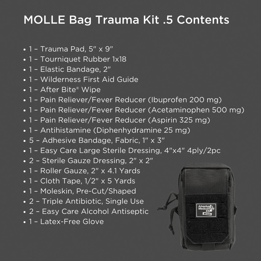 Includes: (1) Trauma pad, 5″ x 9″; (1) Tourniquet; (1) Elastic bandage, 2″; (1) Wilderness first aid quick guide; (1) After Bite sting relief pad; (2) Ibuprofen, 200mg; (2) Acetaminophen, 500mg; (1) Antihistamine, 25mg; (5) Bandage, 1″ x 3″ fabric; (2) Dressing gauze, 4″ x 4″; (4) Dressing gauze, 2″ x 2″; (1) gauze bandage, 2″; (1) Tape, 0.5″ x 5yds; (14) Moleskin, pre-cut and shaped pieces; (2) Triple antibiotic ointment; (2) Antiseptic wipe; (2) Latex free gloves. Comes in black MOLLE compatible zippered carry bag. Hang packaged.