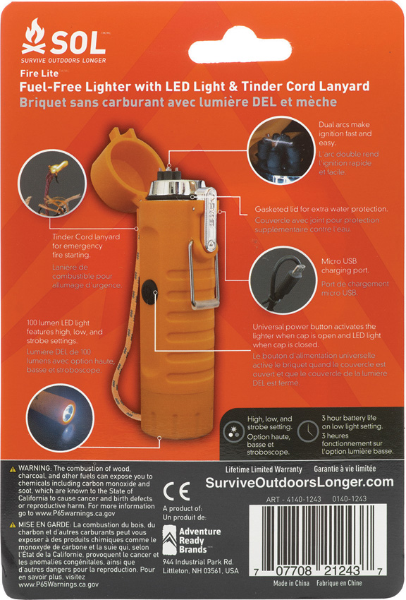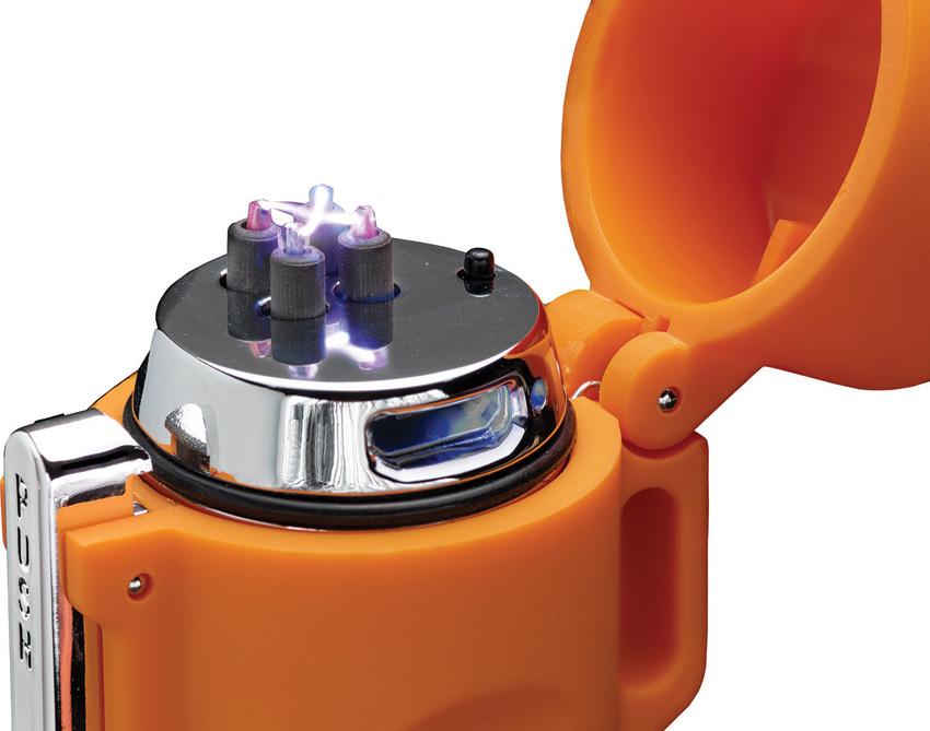 Fuel-free. Integrated 100 lumen LED light and tinder cord lanyard. Sealed lid for extra water protection. Dual arc ignition. USB rechargeable lithium battery. Hang packaged.