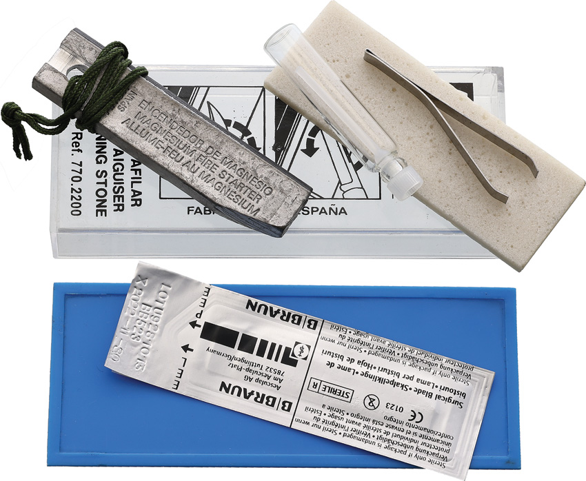 Includes: Sharpening stone; Magnesium fire starter; Tweezers; Glass vial; Sterile scalpel. Comes in plastic box.