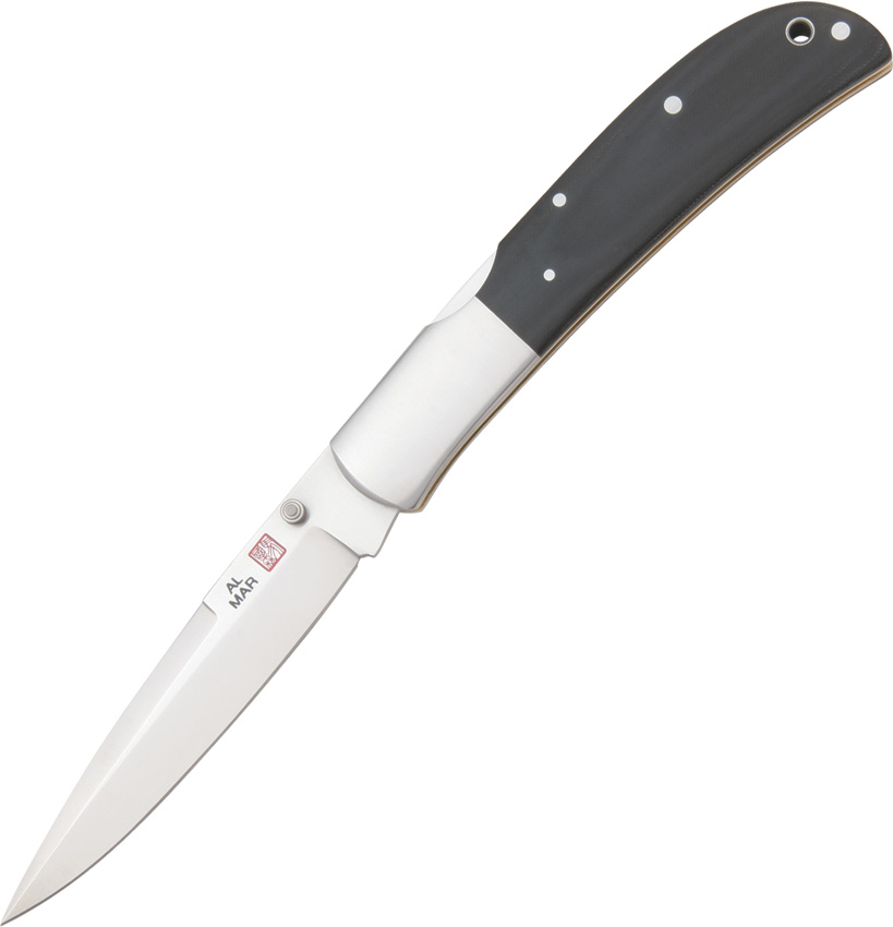 Eagle Lockback. 4.88″ closed. False edge AUS-8 stainless blade. Black micarta handle. Stainless bolster(s). Lanyard hole. Thumb stud. Brown leather pouch.