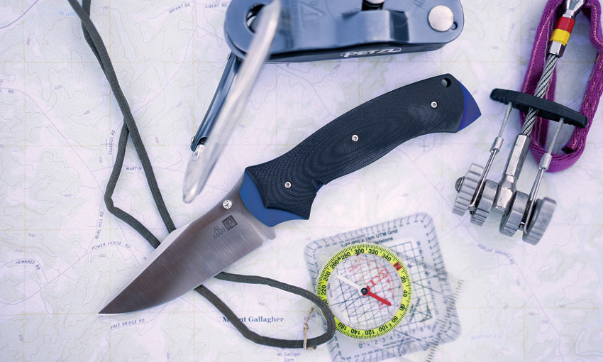 5.13″ (13.03cm) closed. 3.75″ (9.53cm) satin finish D2 tool steel modified clip point blade. Black and blue G10 handle. Thumb stud. Lanyard hole. Pocket clip. Brown leather belt sheath. Boxed.