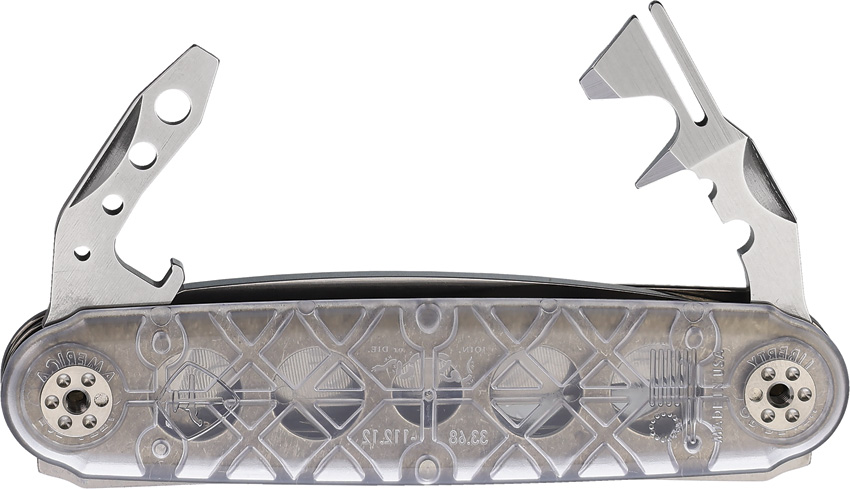 3.63″ (9.22cm) closed. Premium steel blade. Clear synthetic handle. Tools include: Bottle opener l Screwdriver tip. AR-15 compatible bolt scraping tool I Range finder. Boxed.