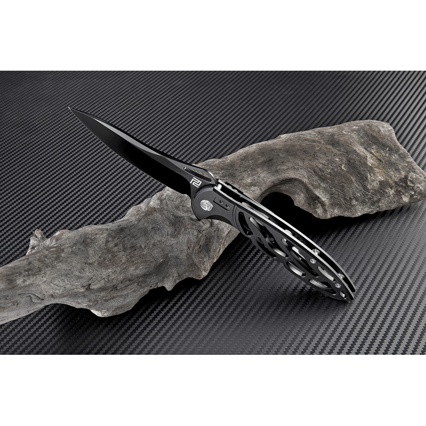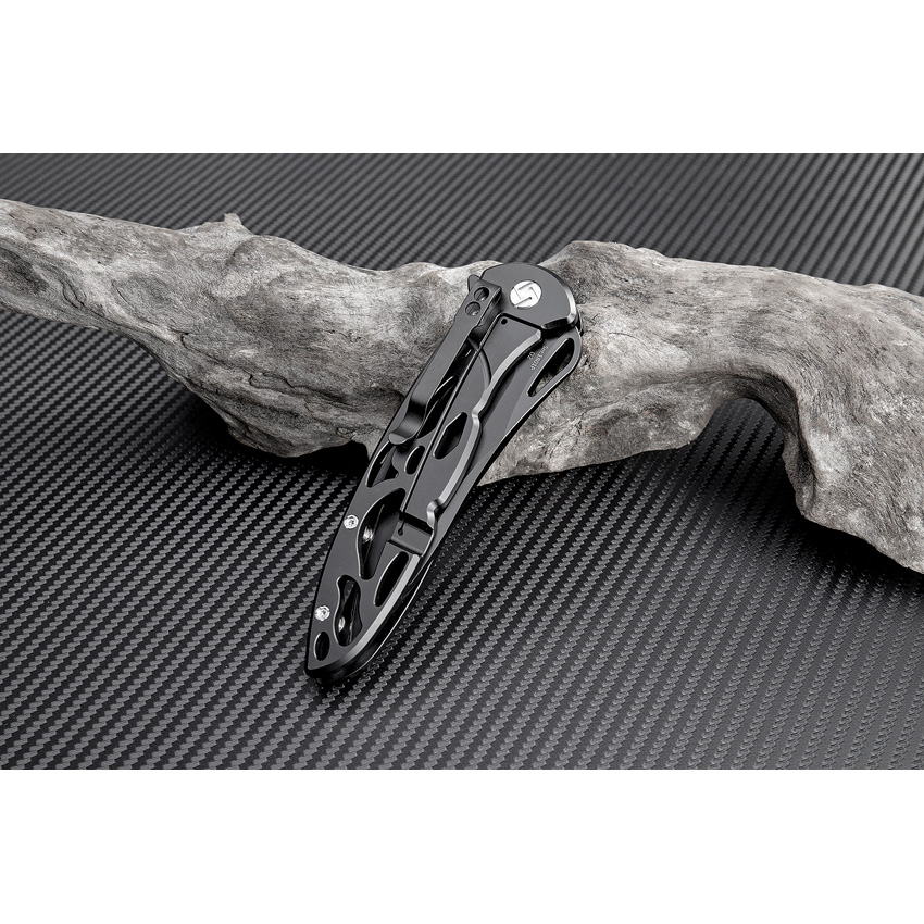 5″ closed. 3.75″ black finish D2 tool steel blade. Black 2Cr13 stainless handle. Extended tang. Lanyard hole. Thumb pull. Pocket clip. Boxed.