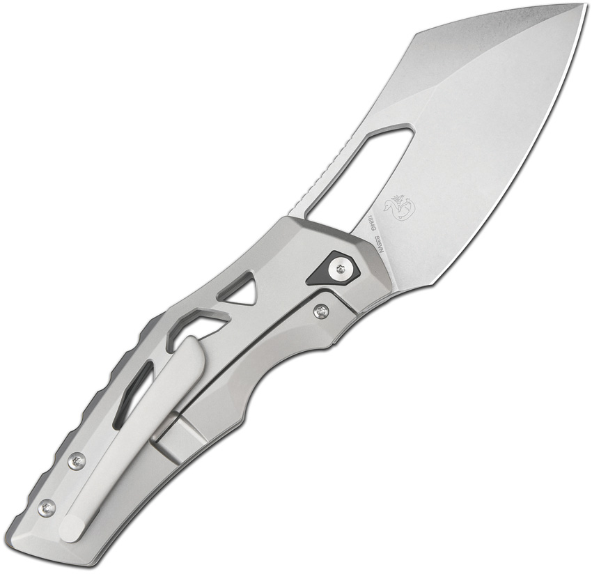 5″ (12.7cm) closed. 3.75″ (9.53cm) stonewash finish S35VN stainless Wharncliffe blade. Gray titanium handle. Thumb pull. Pocket clip. Black nylon zippered storage case. Boxed.