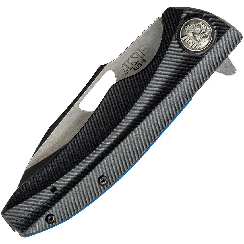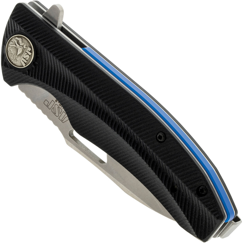 Assisted opening. 4.5″ (11.43cm) closed. 3.5″ (8.89cm) stonewash finish AUS-8 stainless blade. Black grooved G10 handle. Extended tang. Thumb pull. Pocket clip. Blue line tribute spacer. Boxed with hanging tab.