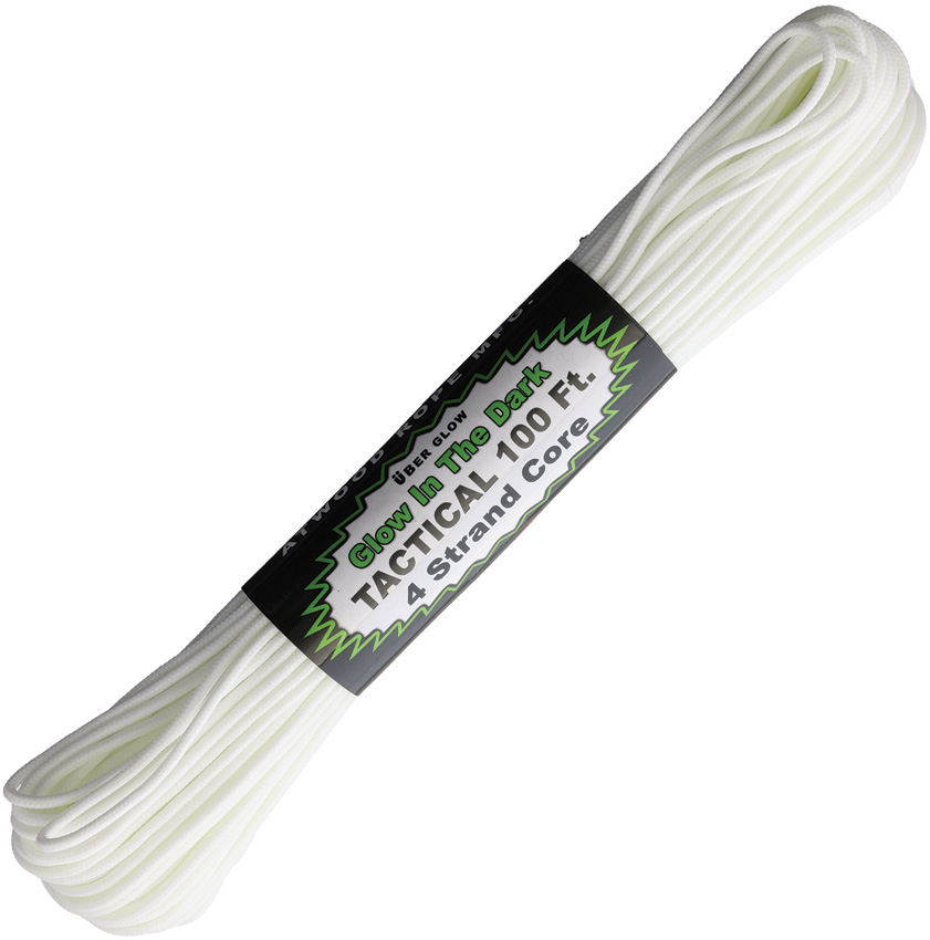 4 strand core. UV resistant. Rot resistant. Color: Uber Glow. Glows for 14 hours. 100ft. Bulk packed.