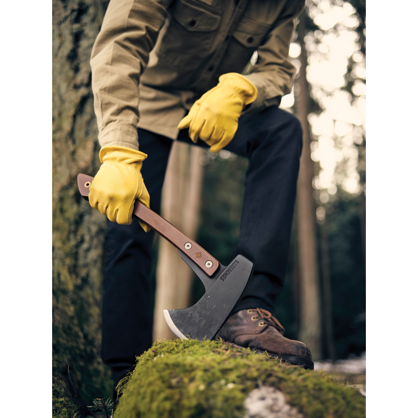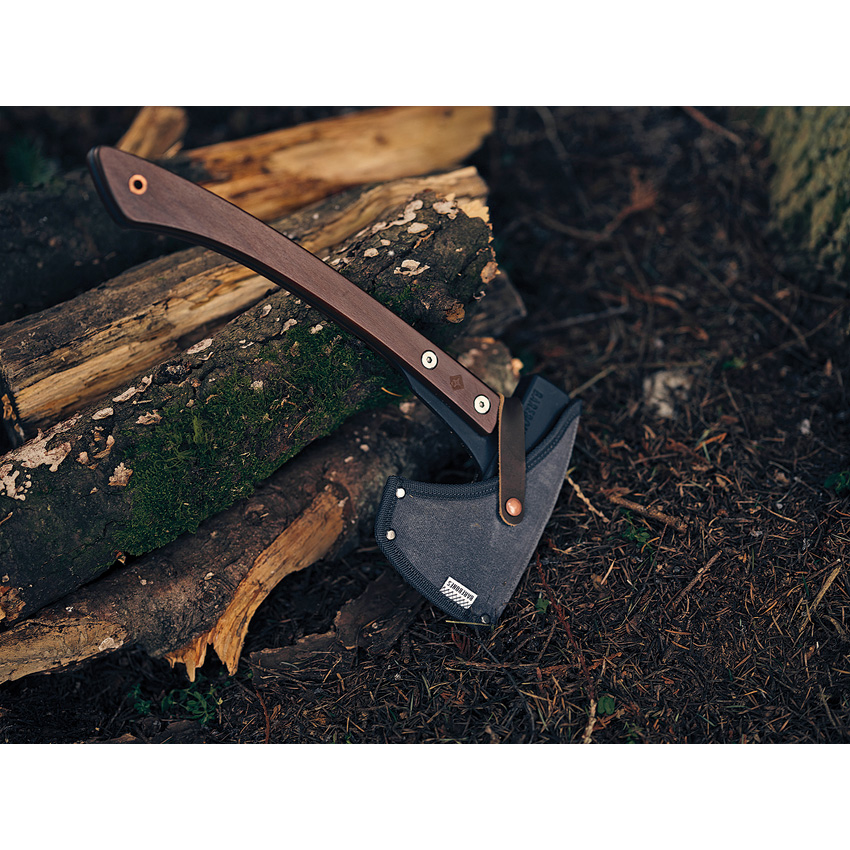 16″ overall. Black finish 1055HC steel axe head. Hickory handle. Full tang. Lanyard hole. Pack weight: 3.75lb. Waxed canvas and leather sheath. Boxed.