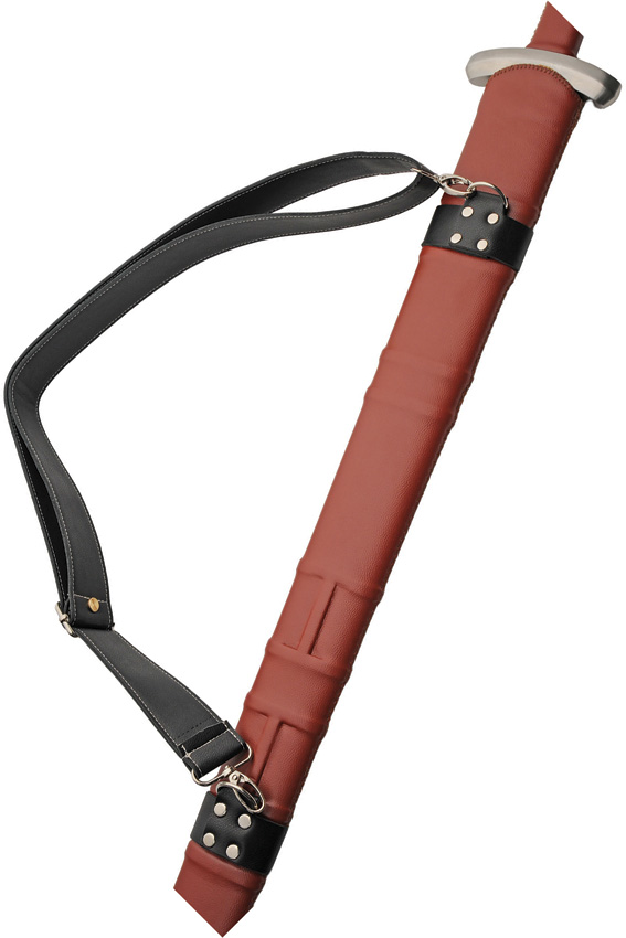 36.75″ (93.35cm) overall. 29.75″ (75.57cm) satin finish 1065 carbon steel blade. Brown leather wrapped handle. Steel guard and pommel. Shoulder strap. Brown wood scabbard. Boxed.