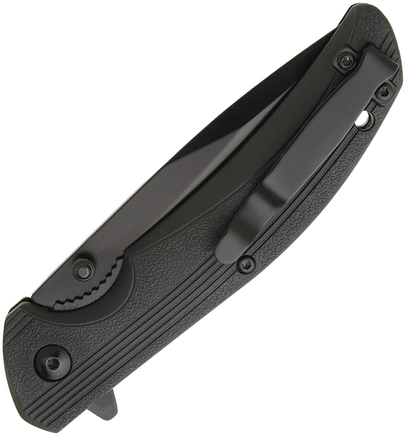 4.5″ (11.43cm) closed. 3.75″ (9.53cm) black finish partially serrated 440 stainless blade. Black Zytel handle. Thumb stud. Extended tang. Lanyard hole. Pocket clip. Boxed.