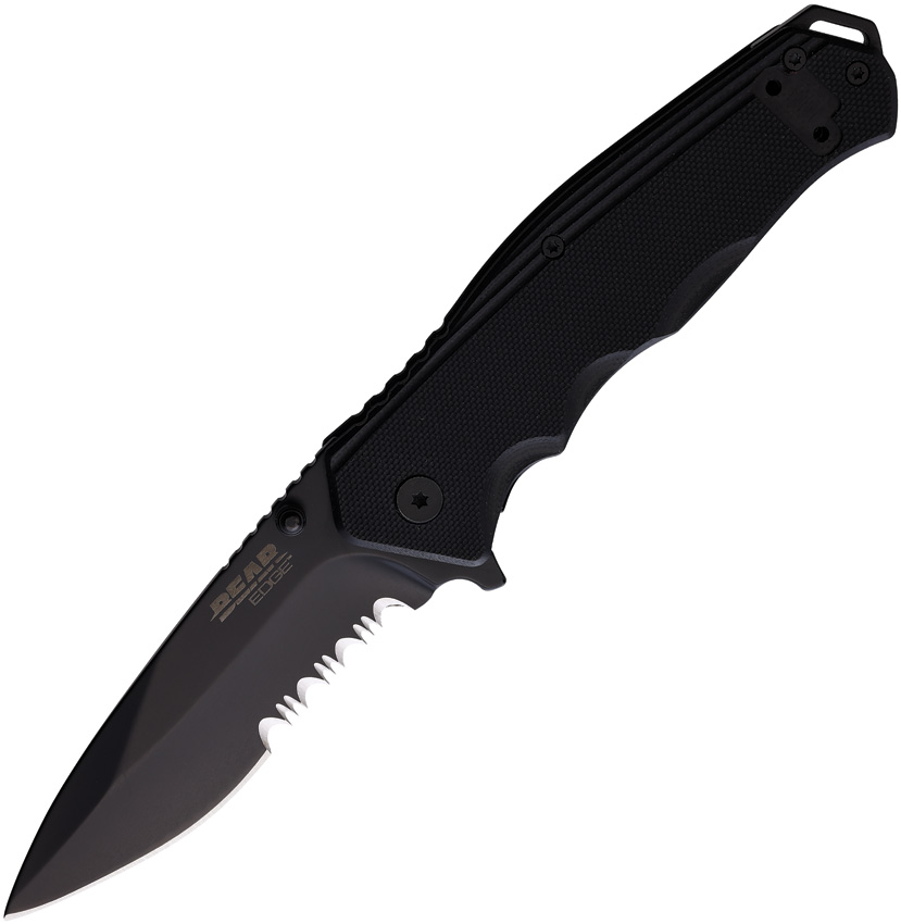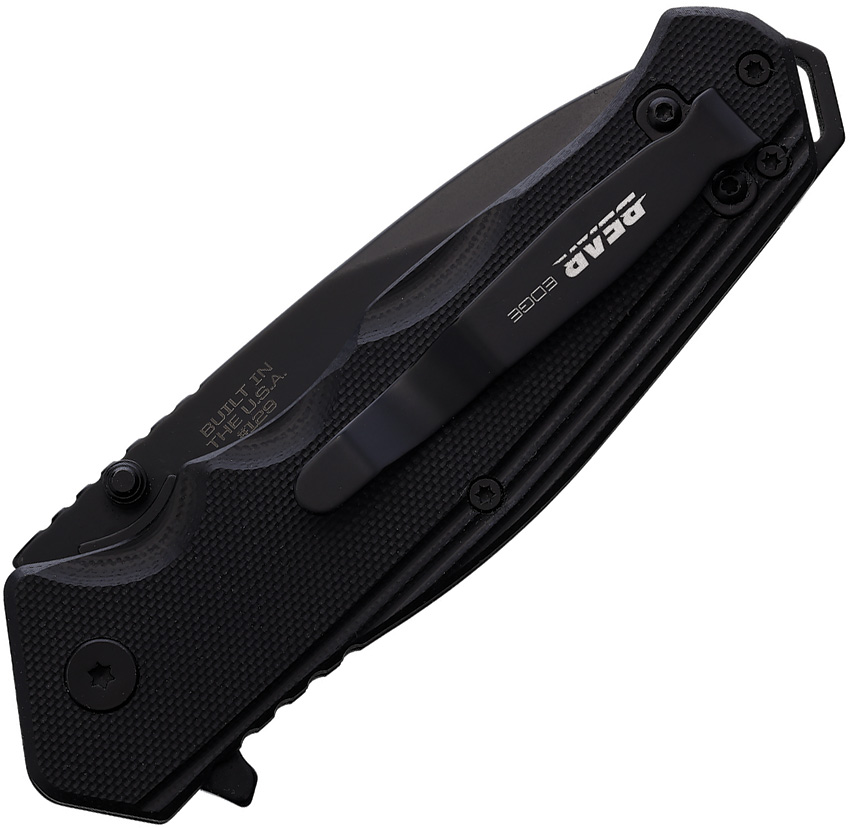 4.5″ (11.43cm) closed. 3.5″ (8.89cm) black finish partially serrated stainless blade. Black G10 handle. Extended tang. Thumb stud. Lanyard hole. Pocket clip. Boxed.