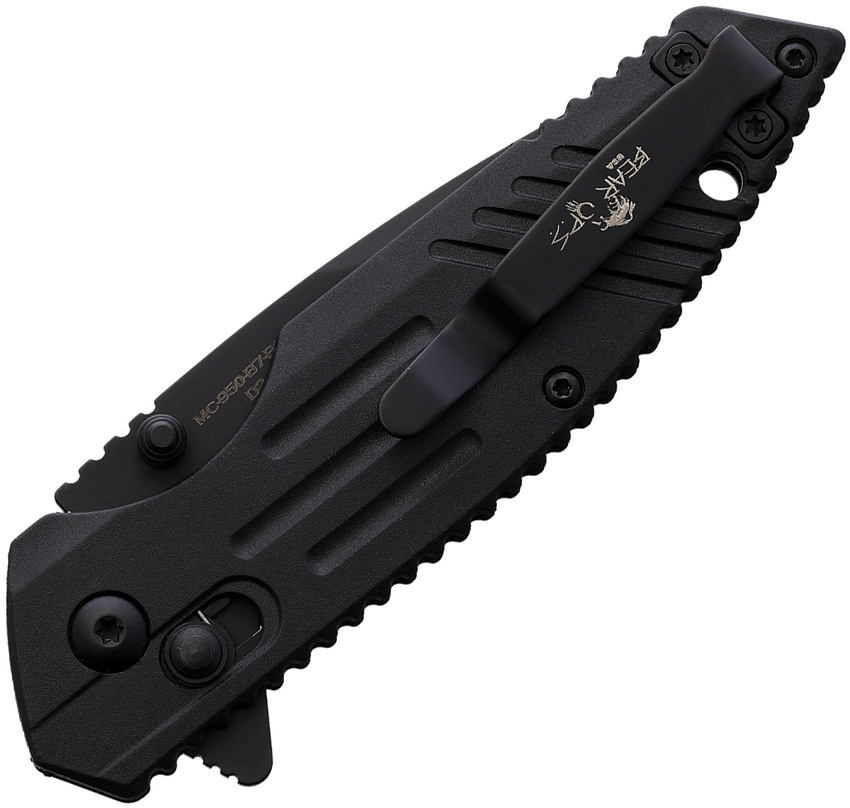 4.25″ (10.8cm) closed. 3.25″ (8.26cm) black oxide coated partially serrated D2 tool steel blade. Black Zytel handle. Thumb stud. Lanyard hole. Pocket clip. Boxed.
