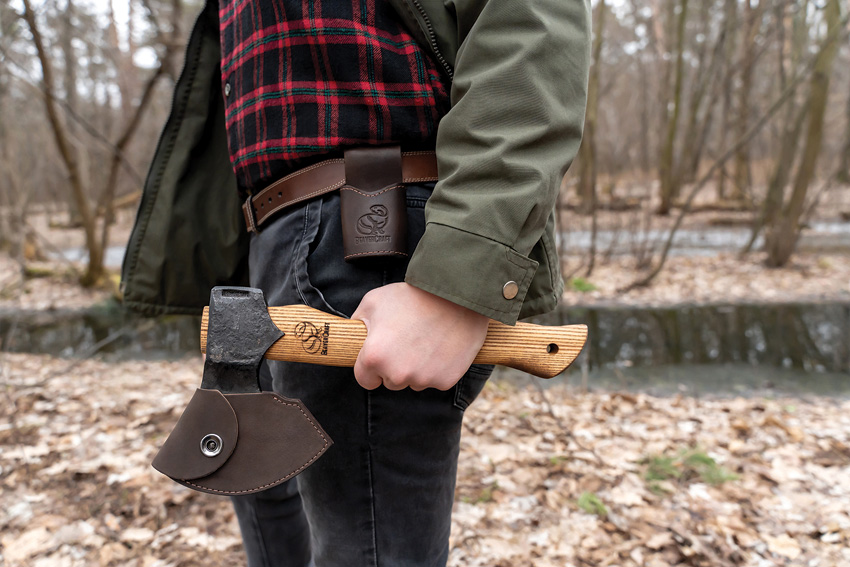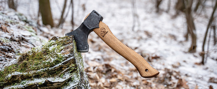 13.2″ overall. 6.25″ forged 1066 carbon steel axe head with 4.63″ cutting edge. Lanyard hole. Ash wood handle. Brown leather belt sheath. Boxed.