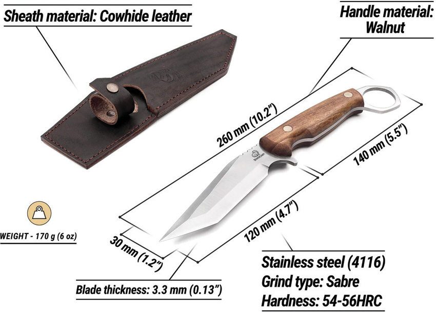 10.25″ (26.04cm) overall. 4.75″ (12.07cm) satin finish saber ground 1.4116 stainless tanto blade. Walnut handle. Full, extended tang. Finger ring. Brown leather belt sheath. Boxed.