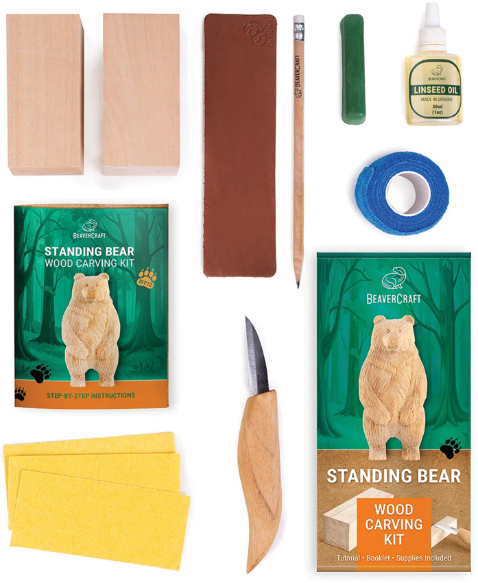 Includes: C16 Big Roughing knife; (2) Basswood blocks; Leather strop; Polishing compound; Cut-resistant tape; Sandpaper (3 pieces); Pencil; Linseed oil; Step-by-step guide. Boxed.