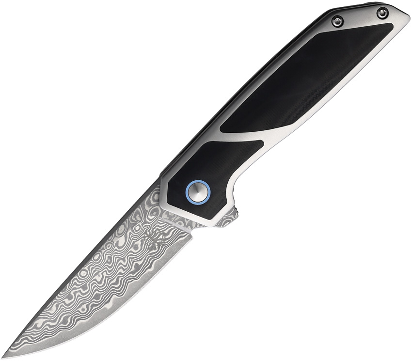 4″ (10.16cm) closed. 3″ (7.62cm) VG-10 San Mai Damascus steel blade. Stainless handle with black G10 inlay. Extended tang. Pocket clip. Boxed.
