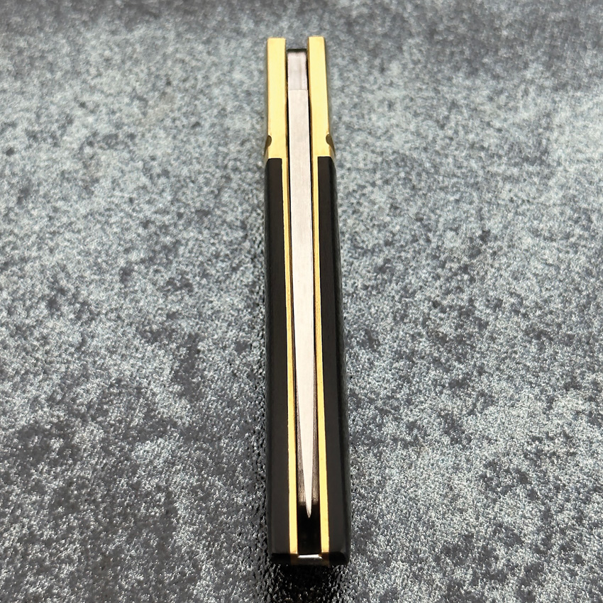 3.38″ (8.59cm) closed. 2.38″ (6.05cm) satin finish 14C28N Sandvik stainless drop point blade. Black G10 handle. Brass bolster(s). Inlay shield. Black nylon zippered storage case. Boxed.