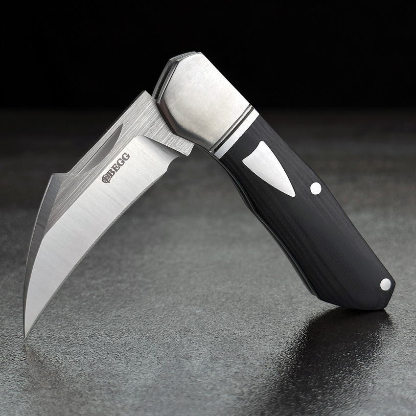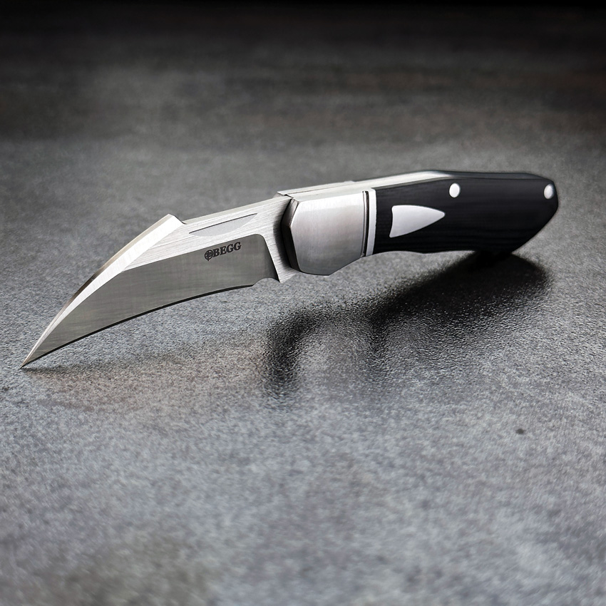 3″ (7.62cm) closed. 2.38″ (6.05cm) satin finish 14C28N Sandvik stainless hawkbill blade. Black G10 handle. Stainless bolster(s). Inlay shield. Slip joint. Black nylon zippered storage case. Boxed.