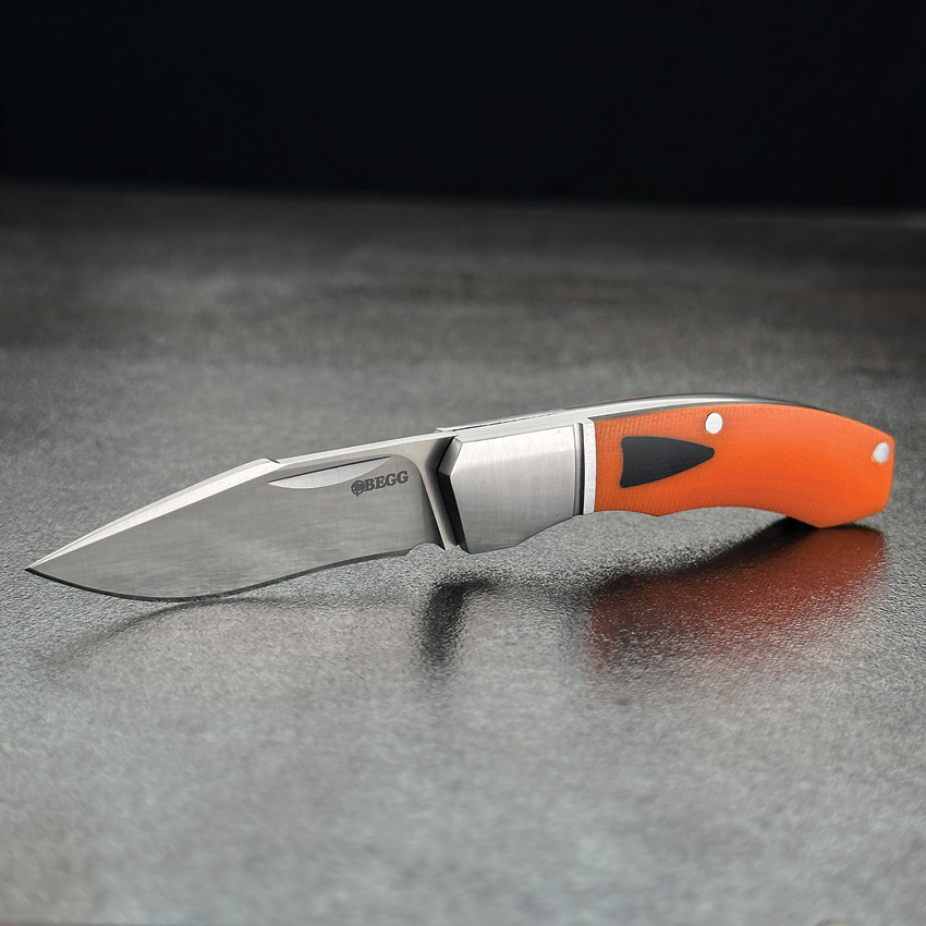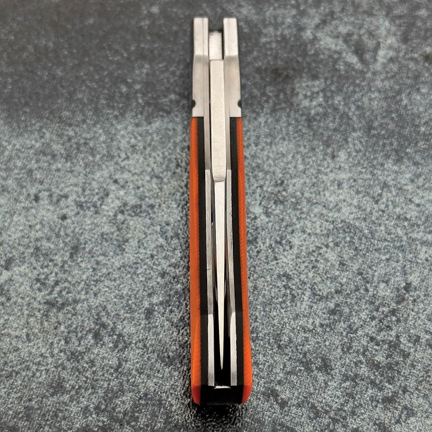 3″ (7.62cm) closed. 2.13″ (5.41cm) satin finish 14C28N Sandvik stainless recurve blade. Orange and black G10 handle. Stainless bolster(s). Black inlay shield. Black nylon zippered storage case. Boxed.