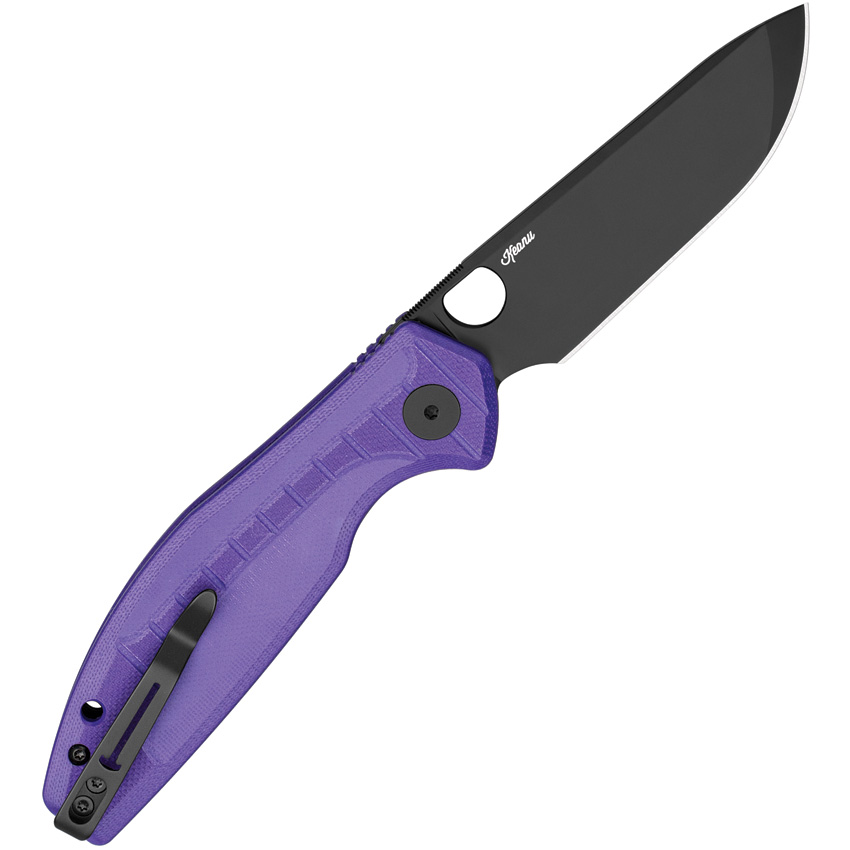 4.5″” (11.43cm) closed. 3.25″” (8.26cm) black PVD coated D2 tool steel blade. Purple G10 handle. Thumb pull. Lanyard hole. Pocket clip. Boxed.