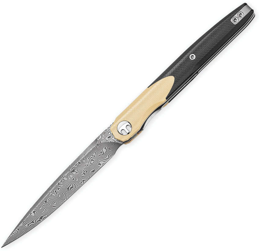 4″ (10.16cm) closed. 3.5″ (8.89cm) Damascus steel spear point blade. Black and tan G10 handle. Pocket clip. Extended tang. Acid etched blade. Boxed.
