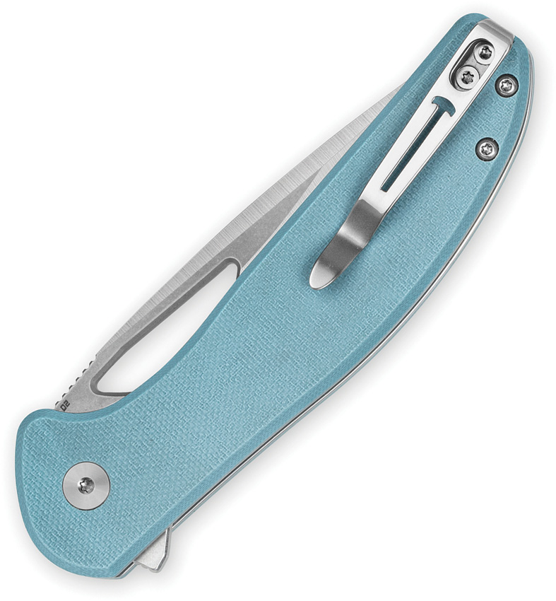4.5″ (11.43cm) closed. 3.38″ (8.59cm) stonewash and satin finish D2 tool steel drop point blade. Blue G10 handle. Extended tang. Pocket clip. Thumb pull. Boxed.