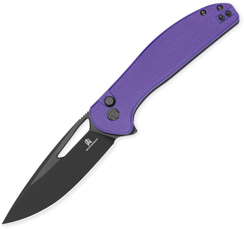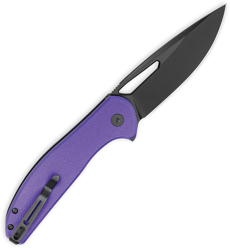 4.5″ (11.43cm) closed. 3.38″ (8.59cm) black PVD coated D2 tool steel drop point blade. Purple G10 handle. Extended tang. Pocket clip. Thumb pull. Boxed.