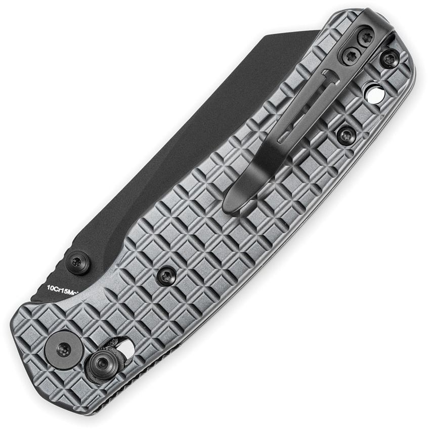 4″ (10.16cm) closed. 3.13″ (7.95cm) black PVD coated 10Cr15CoMoV stainless reverse tanto blade. Gray frag pattern stainless handle. Thumb stud. Lanyard hole. Pocket clip. Boxed.