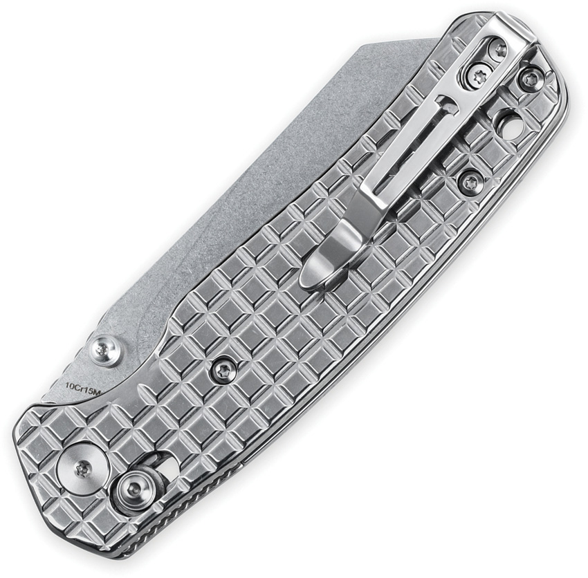 4″ (10.16cm) closed. 3.13″ (7.95cm) stonewash finish 10Cr15CoMoV stainless reverse tanto blade. Polished frag pattern stainless handle. Thumb stud. Lanyard hole. Pocket clip. Boxed.