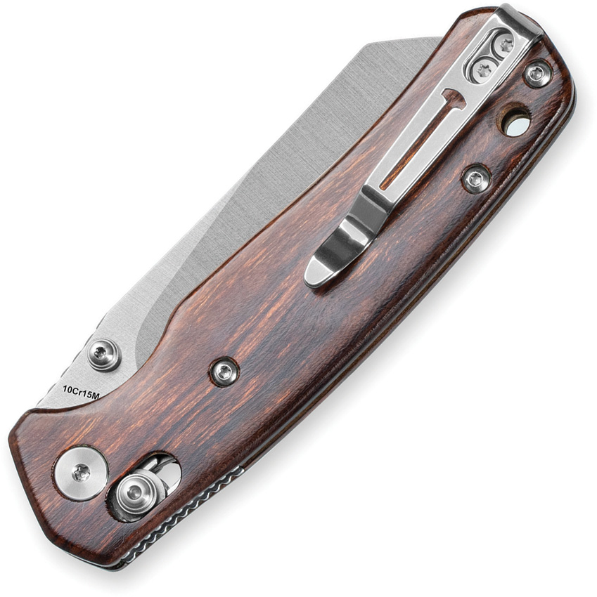 4″ (10.16cm) closed. 3.13″ (7.95cm) satin finish 10Cr15CoMoV stainless reverse tanto blade. Ironwood handle. Thumb stud. Lanyard hole. Pocket clip. Boxed.