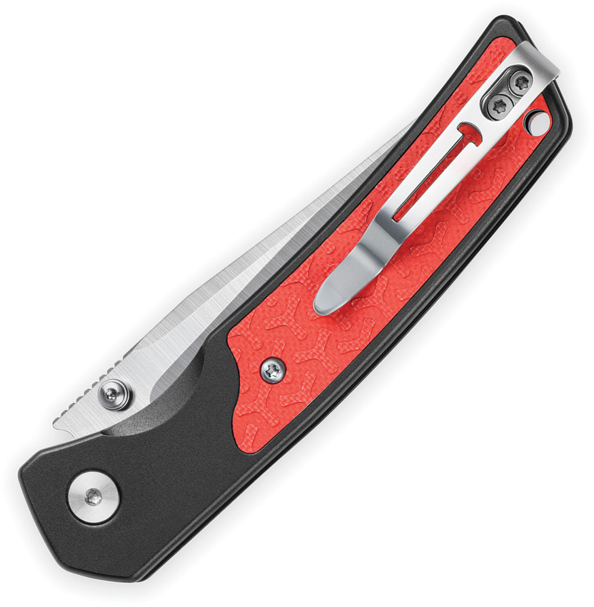 4.25″ (10.8cm) closed. 3.13″ (7.95cm) satin finish D2 tool steel drop point blade. Black matte finish aluminum handle with red G10 inlay. Thumb stud. Lanyard hole. Pocket clip. Boxed.