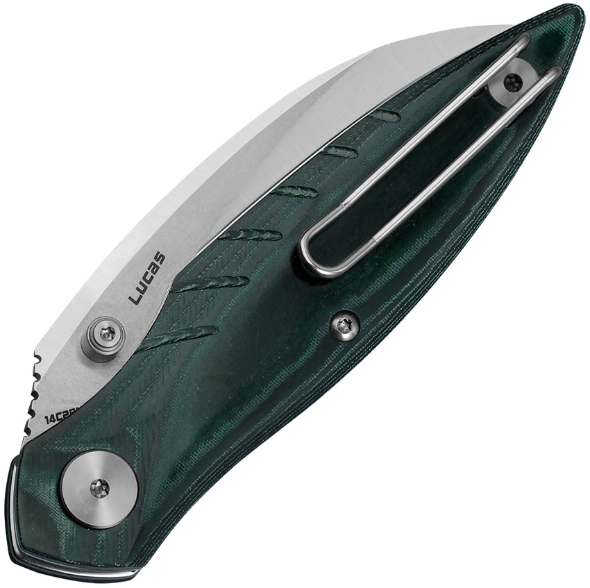 4″(10.16cm) closed. 3″ (7.62cm) stonewash and satin finish 14C28N Sandvik stainless curved blade. Green micarta handle. Thumb stud. Pocket clip. Boxed.