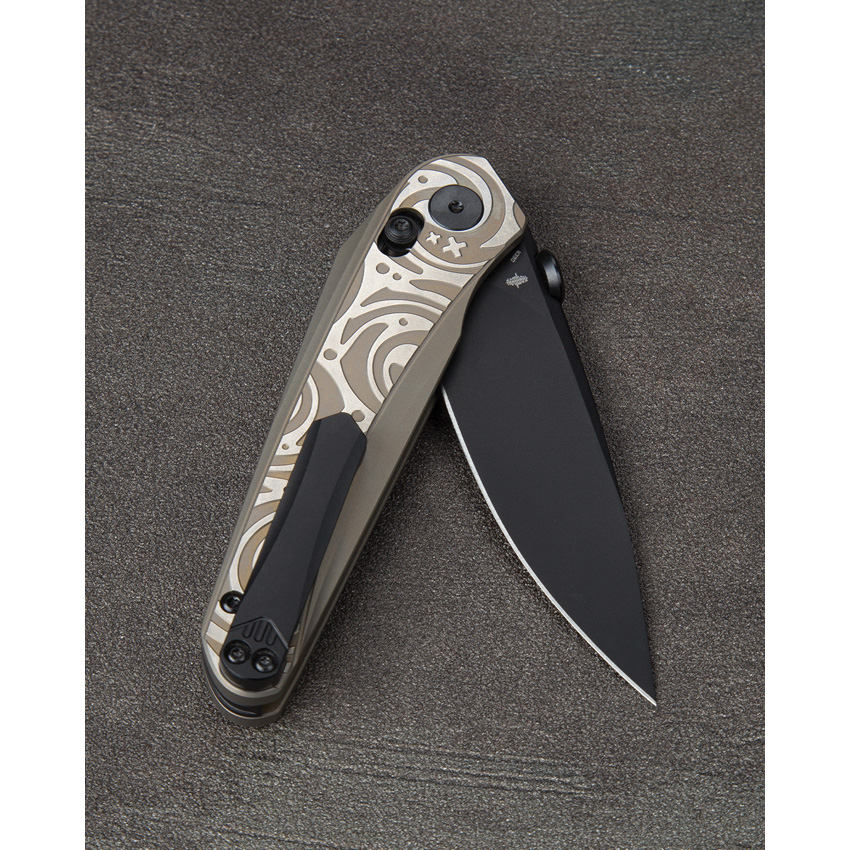 4.5″” (11.43cm) closed. 3.5″” (8.89cm) black finish Bohler M390 stainless blade. Bronze and gray titanium handle. Thumb disk. Pocket clip. Black nylon zippered storage case. Boxed.