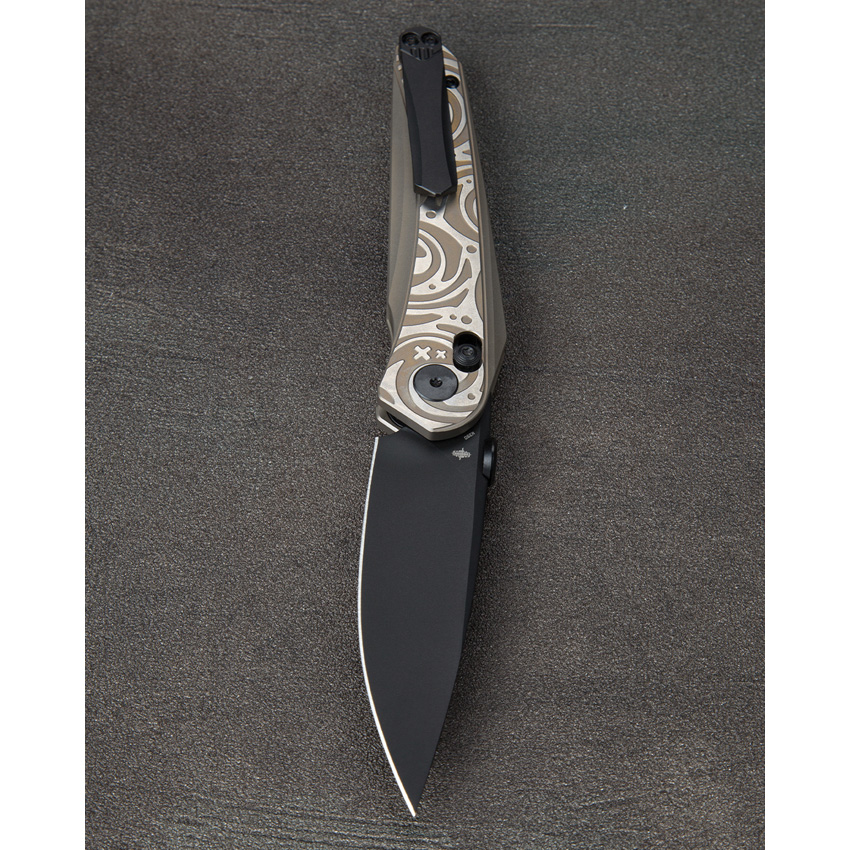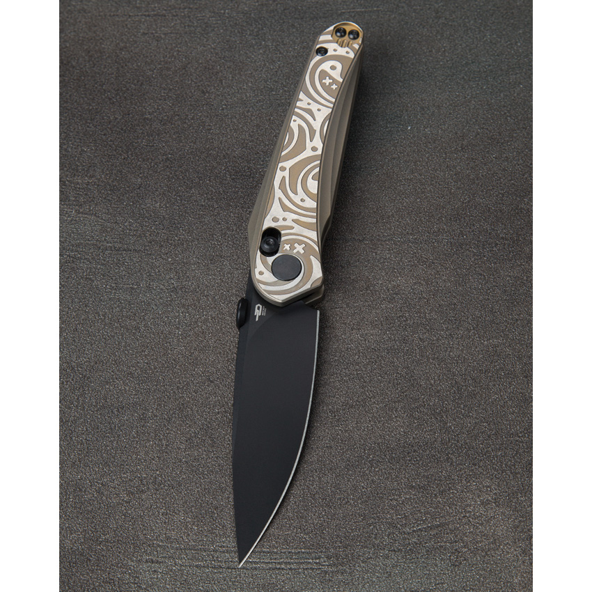The Bestech Knives Mothus Bar Lock Bronze is a compact knife with a closed length of 4.5 inches. The blade, made from Bohler M390 stainless steel, measures 3.5 inches and features a black finish. The handle, made from titanium, is designed in a striking combination of bronze and gray.