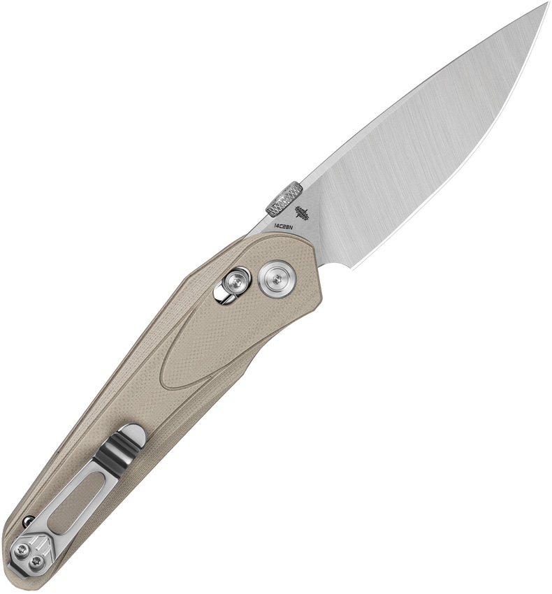 4.5″” (11.43cm) closed. 3.5″” (8.89cm) stonewash and satin finish 14C28N Sandvik stainless blade. Tan G10 handle. Thumb disk. Pocket clip. Boxed.