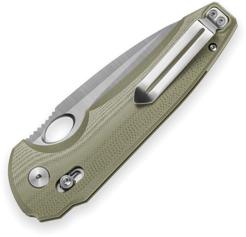 5.13″” (13.03cm) closed. 3.75″” (9.53cm) satin finish 14C28N Sandvik stainless drop point blade. OD green G10 handle. Thumb pull. Pocket clip. Boxed.