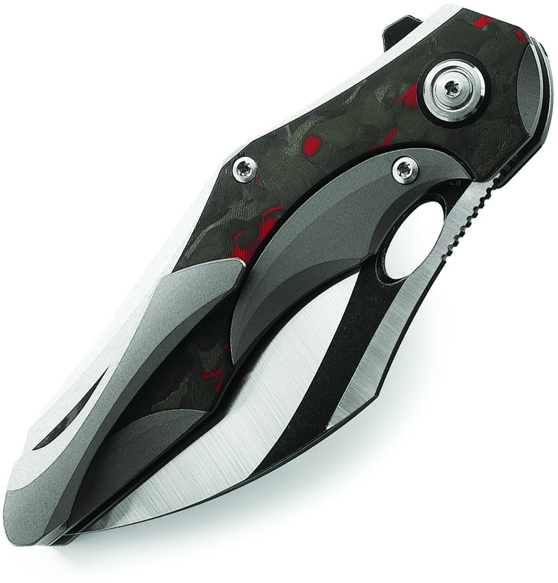 - Gray titanium handle with black and red marble carbon fiber inlay