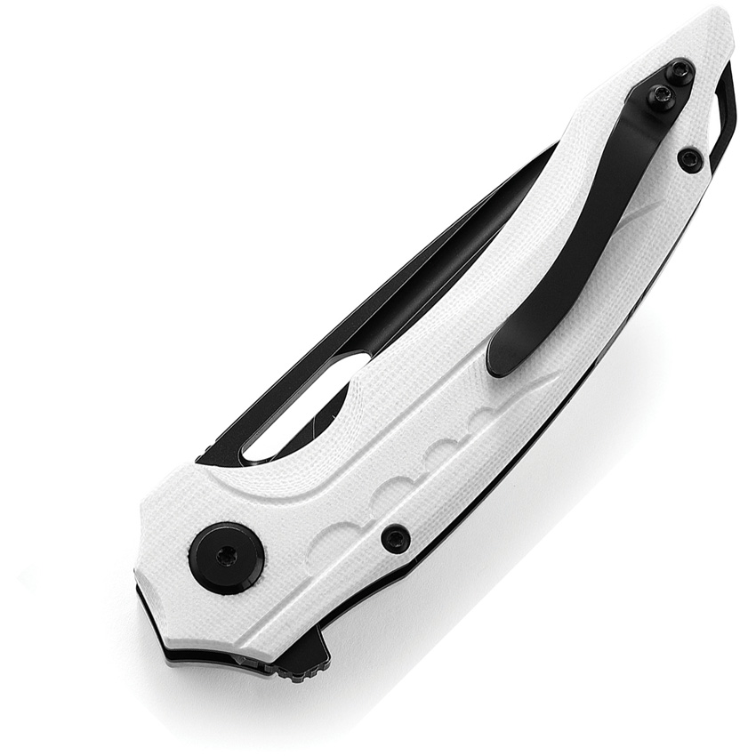 4.5″” (11.43cm) closed. 3.5″” (8.89cm) black stonewash finish Bohler N690 stainless blade. White G10 handle. Extended tang. Lanyard hole. Pocket clip. Thumb pull. Boxed.