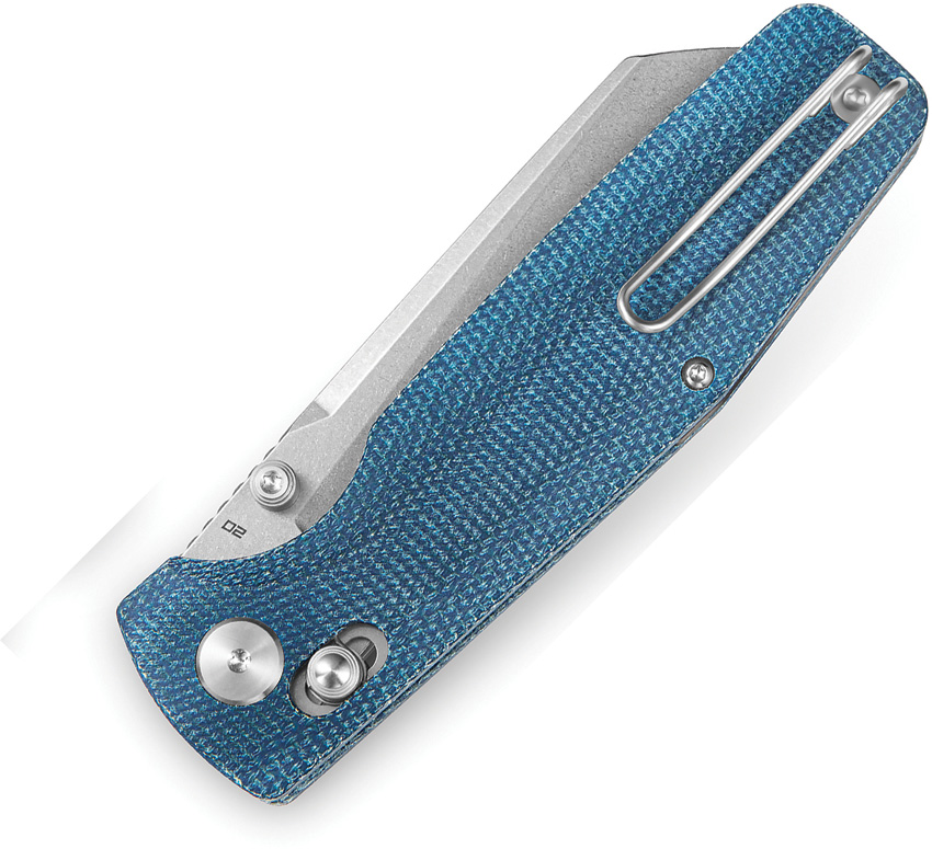 4.38″” (11.13cm) closed. 3.5″” (8.89cm) stonewash finish D2 tool steel blade. Blue canvas micarta handle. Thumb stud. Pocket clip. Boxed.