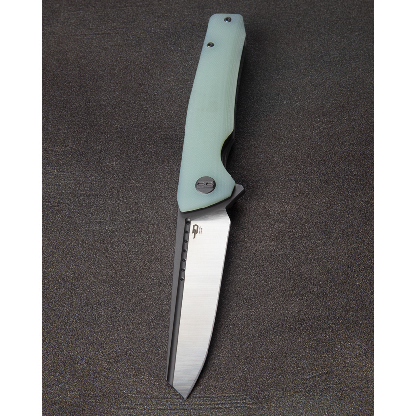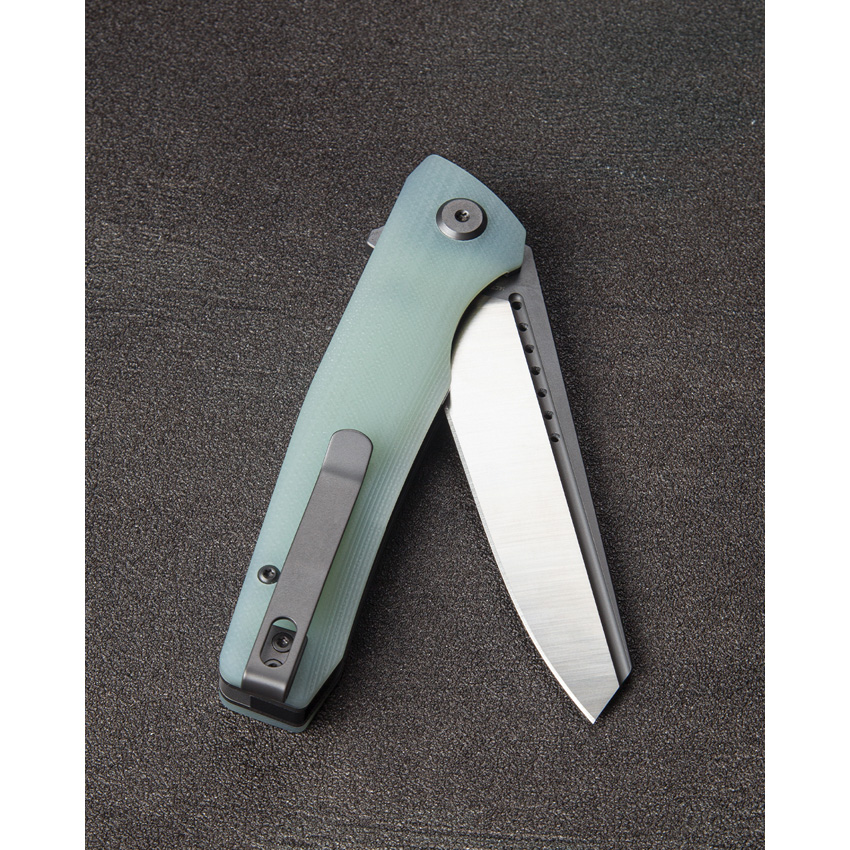 4.75″ (12.07cm) closed. 3.63″ (9.22cm) 14C28N Sandvik stainless blade. Jade G10 handle. Extended tang. Pocket clip. Gray and satin finish blade. Boxed.