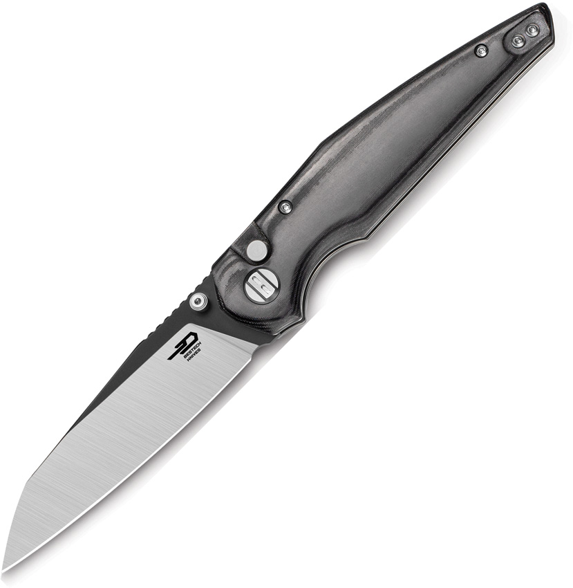 The handle is made from black micarta, a high-strength material that offers superior grip and durability. The knife’s button lock mechanism ensures safe and secure blade deployment, making it a reliable choice for everyday carry.