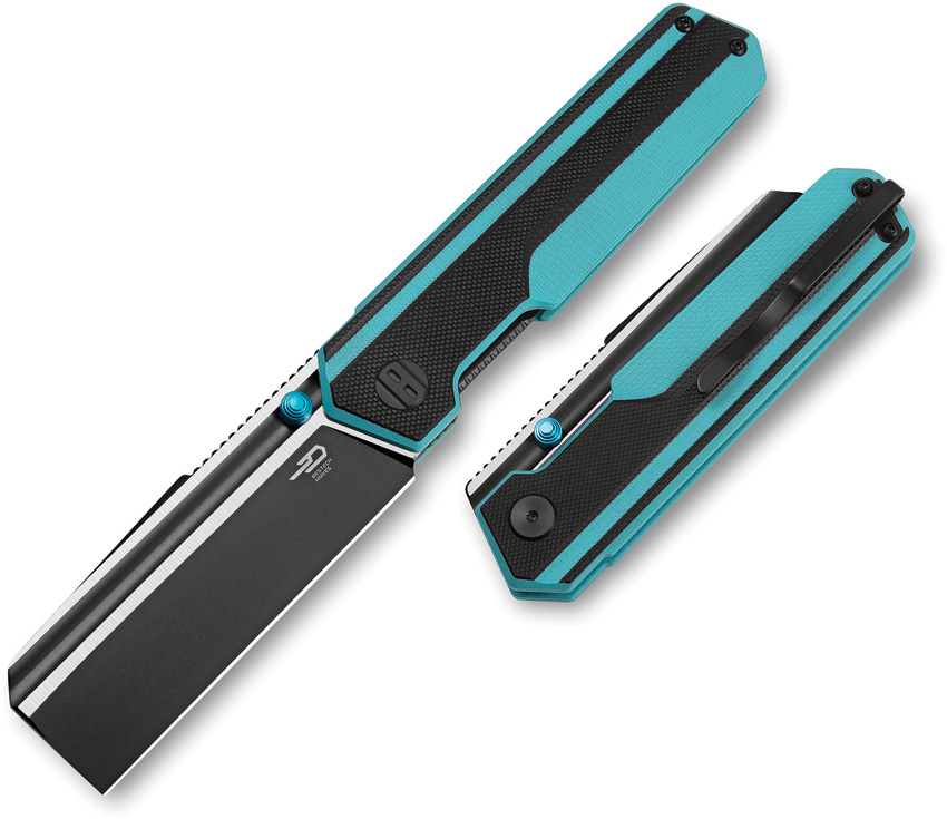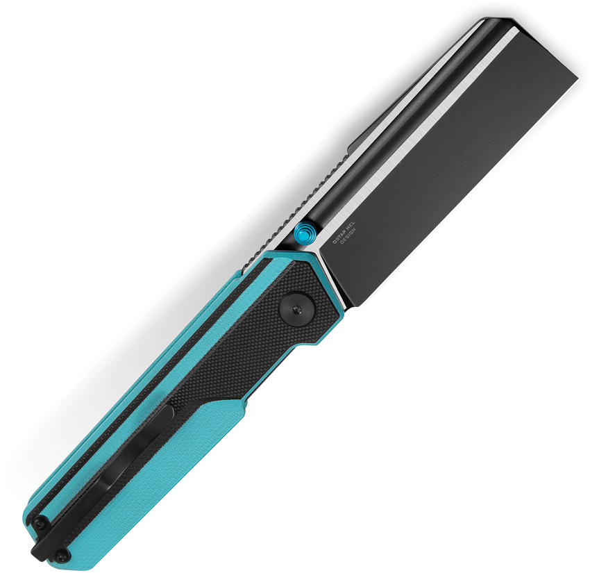 4.5″ (11.43cm) closed. 3.13″ (7.95cm) D2 tool steel blade. Black and teal G10 handle. Thumb stud. Pocket clip. Black and satin finish blade. Boxed.