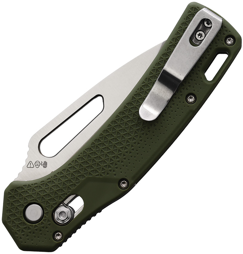 4″ (10.16cm) closed. 3″ (7.62cm) satin finish D2 tool steel drop point blade. Green nylon handle. Thumb pull. Lanyard hole. Pocket clip. Boxed.