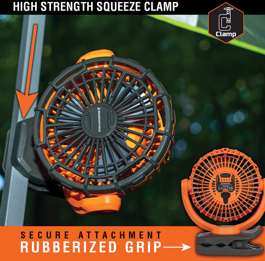 8″ diameter. Fan cage spins and rotates 360 degrees. Mounting hooks and hanging hole. Strong mounting clamp. Modes: High (5h runtime); Low (9h runtime). Rechargeable via USB charging cable. Requires (1) Lithium battery (included). Boxed with hanging tab.